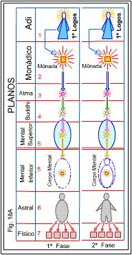 A figura 18A, numa forma simplista, mostra parte dessa metamorfose. Na coluna indicada por 1ª Fase temos o arcabouço inicial do Elemental. Nesse período, como se comentou na apostila 17, o corpo Mental é apenas um esfumaçado ovóide e o Astral pouco consistente. Na coluna da 2ª Fase, que se avizinha do limiar humano, o corpo Mental já delimita uma forma mais "palpável" e o Astral já apresenta contorno próximo ao dos humanos. (Vide figura 19C, apostila 19).