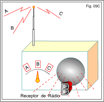 Na figura vemos as ondas "A", "B" e "C" igualmente tocando a antena do rádio. O ponteiro indicador de seleção, aponta para a onda "B". O alto-falante reproduz o conteúdo da onda "B". As demais ondas, como visto, também alcançam o aparelho, e permeiam o mesmo ambiente, mas este as ignora. O dispositivo de escolha, ou sintonia, na posição em que se encontra permite somente perceber a onda "B".