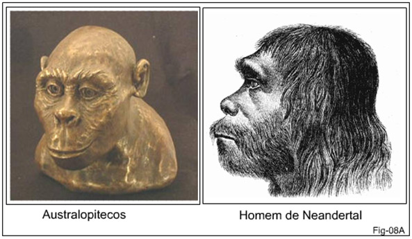 (Australopithecus = Latin: australis que significa “do sul” – grego: pitekos “macaco”. Gênero de hominídeo extinto, bastante próximo ao gênero Homo. Um fóssil encontrado na África foi datado de 2,5 a 2,9 milhões de anos atrás. - - - Homo neanderthalensis = habitou a Europa e Ásia de 300 mil anos atrás até 29 mil anos atrás. [Imagens e texto de Wikipédia]