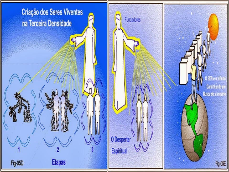 Figura 05D simboliza a criação de seres viventes, humanoides, na terceira densidade. Etapas: 1 – primitivos; 2 – a transição primitivos/homo sapiens; 3 – homo sapiens/sapiens.