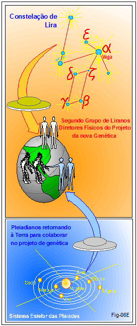 Os liranos eram os diretores físicos desse projeto (sob a supervisão dos Fundadores), e aceitavam, também, assistência de outros grupos físicos tais como os sírios. Logo se viu que para seu projeto necessitavam uma estrutura genética de origem terrestre e também extraterrestre. Contataram os pleiadianos. (Figura 06E)