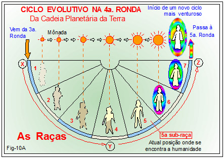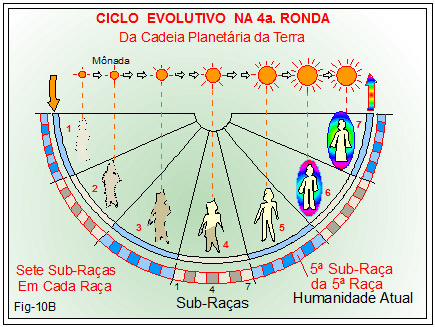 A figura 10A, acima, mostra o quadro sinótico dos ciclos evolutivos do Ser humano no período compreendido da quarta (4ª) Ronda da Cadeia Planetária da Terra.