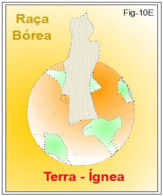 No mapa da figura 10D indicamos a região onde habitavam os seres da Raça Bórea. Entretanto, tenham em conta que a distribuição dos continentes, naquela era, não é a demonstrada no mapa. O planeta Terra passou por vários cataclismos que, a cada um, ia remodelando as disposições continentais. O mapa acima só nos serve como referência ao posicionamento do quadrante Norte.