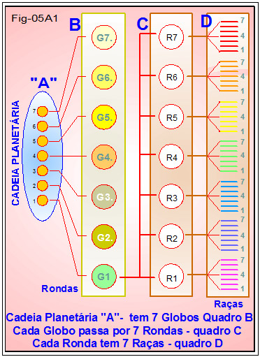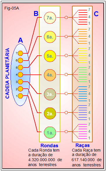 As figuras 05A e 05A1, que nesta repetimos, informa que o ciclo evolutivo das Mônadas numa Cadeia Planetária percorre sete (7) Rondas.