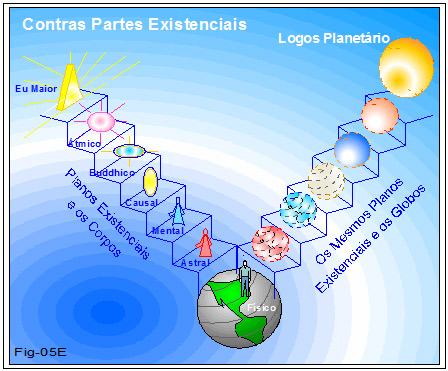 Nesta figura 05E vemos, à esquerda, o Homem e seus corpos. (Ver a série A Criatura) À direita a representação do globo terrestre e seus globos, dispostos nos diferentes planos existênciais correspondentes aos mesmos planos em que o Homem tem seus corpos, e vice-versa.