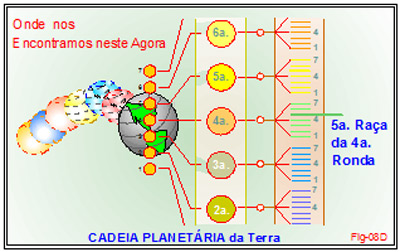 A figura 08D faz a representação de onde se encontra a humanidade atual da Terra. Situa-se na quinta (5ª) Raça da quarta (4ª) Roda. Portanto, desde sua gestação no cenário da Cadeia Planetária Terrestre, já percorreu todas as sete (7) raças das primeira, segunda e terceira Rondas, e também a primeira, a segunda, a terceira, a quarta e metade da quinta raça da quarta (4ª) Ronda.