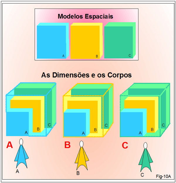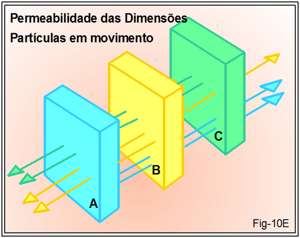 Esta figura 10E faz amostragem da permeabilidade das dimensões. Vemos partículas da dimensão A trespassando pelas dimensões B e C; partículas da dimensão B trespassando pelas dimensões A e C; partículas da dimensão C trespassando pelas dimensões A e B.