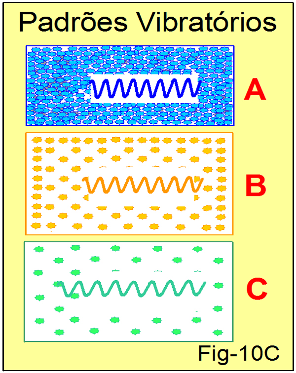 Na figura 10D as ondas vibracionais dos respectivos quadros da figura 10C. No quadro D as ondas são mostradas individualmente. No quadro E elas estão em conjunto, uma perpassando pelas outras sem, contudo, se obstruírem ou confundirem.