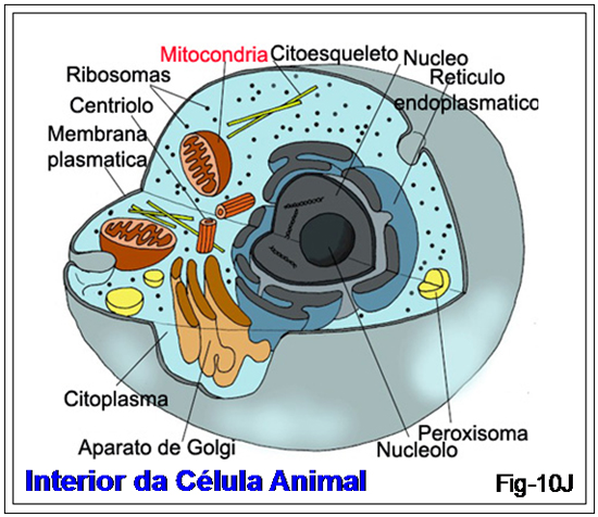 Mas, antes de prosseguir, para os que não conhecem, temos a figura 10J onde se vê a representação de uma célula animal – incluindo também o bicho homem. Nela se destaca, em letras vermelhas, a organela Mitocôndria, que nos interessa neste estudo.