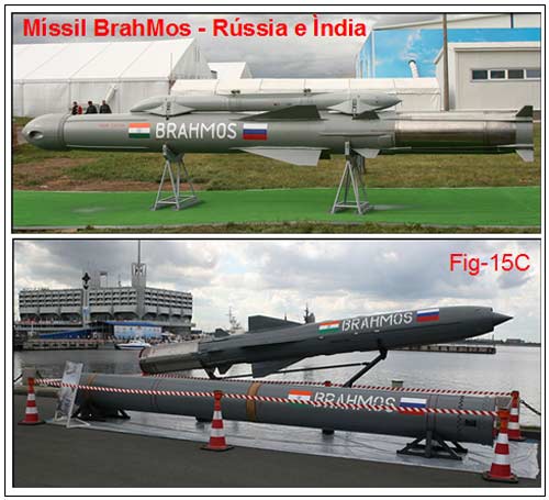 O Míssil BrahMos que se vê na figura 15C é poderosa arma supersônica pertencente à Rússia e à Índia, como podem ser vistos os desenhos das bandeiras daqueles países impressos na fuselagem. (Fotos extraídas de http://pt.wikipedia.org/wiki/BrahMos).