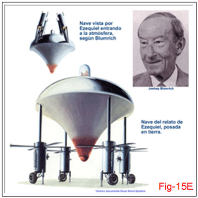 Querem ver uma coisa. O engenheiro da NASA Josef F. Blumrich, em seu livro As Naves de Ezequiel, diz que o vivido por ele, Ezequiel, não foi um encontro com Deus, mas uma interação com astronautas vindos de outros planetas. Compulsando os dados do profeta, Blumrich desenhou, e patenteou, um engenho, o modelo que é visto na figura 15E.