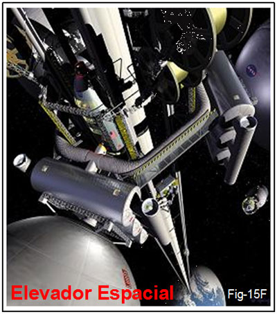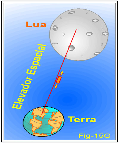 A figura 15G demonstra o que vem a ser o Elevador Espacial. Uma linha direta, cabos estendidos no espaço, por onde cabines estariam suspensas, viajando entre a Terra e a Lua, transportando pessoas e artefatos.