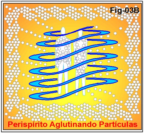 Nesta figura 03C, quadros A e B, representa-se a continuidade da aglutinação molecular e, por consequência, como mencionado, a manifestação do corpo físico.