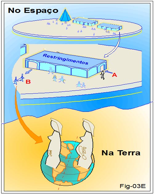 Sendo assim, como ensina o autor espiritual André Luiz, em seus livros psicografados por Chico Xavier, por títulos Evolução em Dois Mundos, capítulos 2 e 19, e Entre a Terra e o Céu, capítulo 15, informa que quando são feitas as preparações para uma encarnação o perispírito passa pelo processo de restringimento – encolhimento, redução em seu tamanho. E´ neste ponto que entra sua peculiaridade plástica, para, dessa forma, poder acomodar-se na matriz uterina de sua genitora. Na figura 03E representamos a colônia espiritual onde se situa uma edificação, o Centro Operacional de Restringimentos. A letra A indica o indivíduo a ser processado acessando a entrada, e a letra B, a saída, após o processamento. Dali, endereçando à Terra, não aleatoriamente mas devidamente planejado, o acontecimento da gestação de um novo ser.