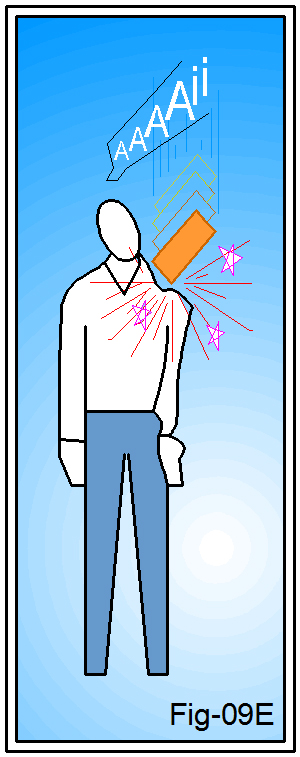 Todavia, como já provado pelos estudos da física molecular, o que chamamos de matéria sólida, na verdade, não é tão sólida como a vemos e sentimos, apesar de, se formos atingidos por uma tijolada isso nos “provará” que ele é bem durinho e machuca bastante. Mas esse efeito vem da razão relativista da matéria em cada uma de suas dimensões. Figura 09E.