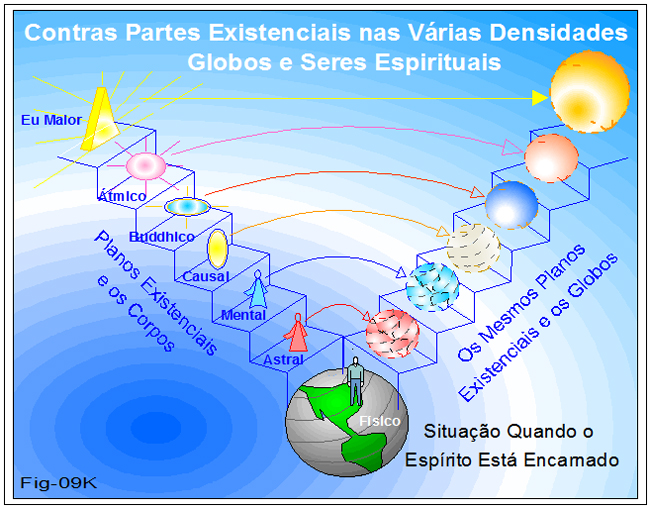 A figura 09K mostra a representação de um Ser encarnado na Terra. Nela vemos todos os seus corpos, desde o físico até o Atmico, Também, ao lado direito da figura, os vários globos que são as densidades, correspondentes aos corpos.