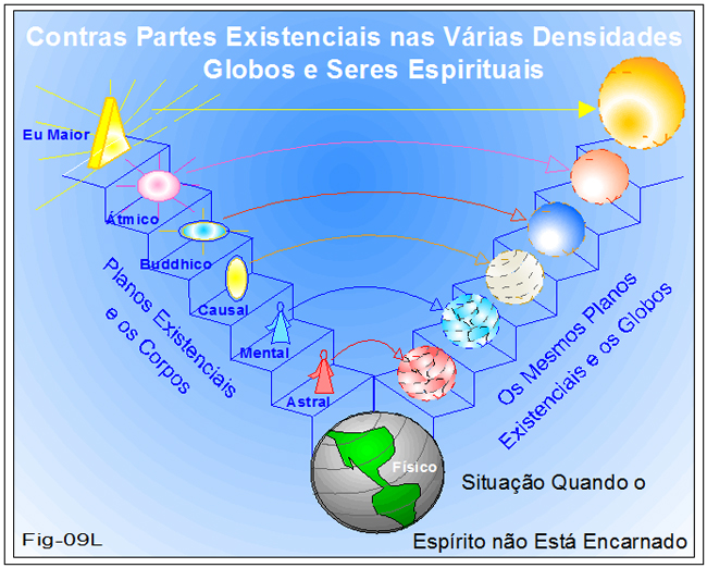 A figura 09L mostra a situação de quando o mesmo Ser já não se encontra encarnado. Ele já não utiliza de um corpo físico, entretanto, a Terra física continua existindo. Os outros corpos, também continuam existindo nos correspondentes globos, ou densidades.