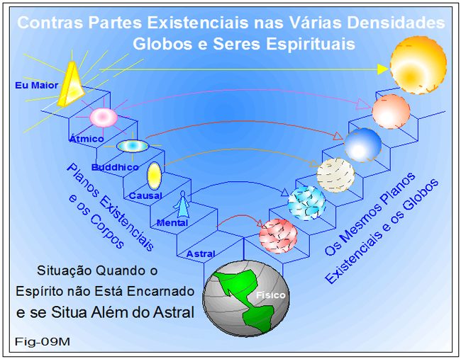 A figura 09M faz a representação não só de quando o Ser já não se encontra encarnado como, também, quando, por maior evolução, situa-se em planos, ou densidades, acima do Astral. Entretanto, os globos Astral e Físico continuam existindo.