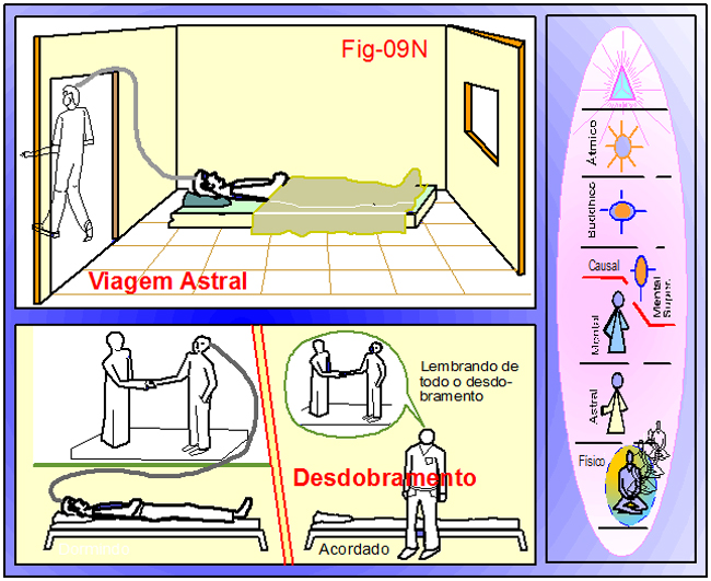 Em razão disso, pelos processos de meditação, de desdobramento consciencial ou viagem astral, o indivíduo, sem sair de onde se encontra, passa a ter ações conscientes no plano, ou densidade, que lhe for possível atingir. Figura 09N.