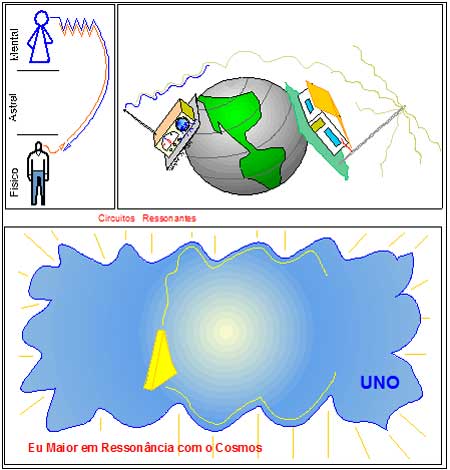 No terceiro exemplo, figura inferior, vemos o Cosmos, o Todo, e nele, inserido os Eus Maior de todos os zilhões de seres já criados – na figura representados por um só. Estes vibram, quando assim conhecedores e desenvolvidos através dos processos de meditação, vibram em ressonância com os padrões cósmicos das energias. Portanto, estão em igualdade de frequência. Estão em equilíbrio com o magnetismo mental do Todo. Em condições, portanto, de sentirem essa atração que os arrasta na direção expansiva de Si Mesmos. Ou, expansão consciencial.