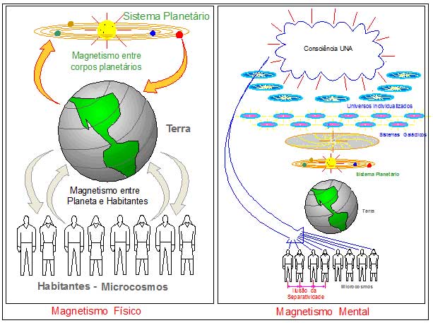 Da apostila 6 da série O Amor, repetimos aqui a figura acima, onde se expressa as duas modalidades de magnetismo a que nós, viventes na Terra, estamos submetidos. O magnetismo físico que nos imanta ao planeta. Este magnetismo é limitador, confinando-nos neste só espaço físico que, na atualidade, como visto, está mais se parecendo com um barril superlotado. E o magnetismo mental que interliga, nossos Eus Maior – a nós mesmos - de toda a população planetária, com o Todo Cósmico. Este outro magnetismo é extensor. Numa linguagem simples, uma espécie de saca-rolhas que nos destaca do gargalo da dimensão física e nos lança no espaço. Expansão, liberdade mental.