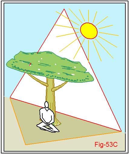 Deixe-se ficar dentro dela, da imagem visuali-zada, e sinta a quietude que ela lhe concede. Acomode-se. Veja na figura 53C o que ela sugere. Sente-se sob a frondosa árvore. Encoste e sinta o tronco a suas costas. Sinta, também, o contato com o chão. O “calor” inspirativo daquele Sol e a sombra amena da árvore. Sinta que só você está ali. Parecendo que o restante do universo desapareceu. Este profundo silêncio exterior vai lhe permitir ouvir sua voz interior. Não reprima a espontaneidade do que ela lhe falar. Pode, de início, lhe parecer dizeres desconexos. Sem fundamentos. Até mesmo, coisas bobas na sua conceituação. Deixe. Não preste muita atenção a isso. Apenas sinta. São seus sentidos ocultos se despertando. Olhos, ouvidos, e sentidos do tato, formas extras que você nem sabia possuí-los. Eles lhes trazem percepções novas. Percepções que vêm das outras dimensões de você mesmo.