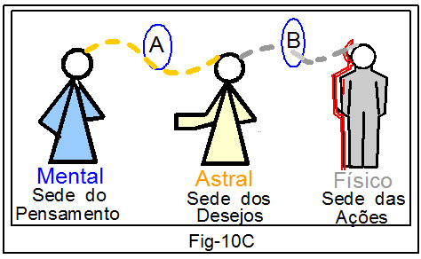 Quando os corpos se desacoplam, por motivos vários a que nos referiremos mais à frente, os tenuíssimos filetes de energia se concentram num só centro, formando um cordão.  Dessa formação temos o cordão de Ouro, representado na figura acima pelo segmento “A”, interligando o corpo Mental ao corpo Astral, e o cordão de Prata, segmento “B”, interligando o corpo Astral ao corpo Físico.  Os estudos do Cordão de Prata e Cordão de Ouro serão vistos na apostila 12.