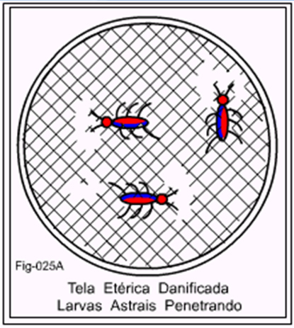 Assim é com a tela Etérica dos chacras.  Quando nos enfraquecemos, moral ou psicologicamente, o que por conseqüência traz a falta de energia adequada a cada chacra, pois geralmente a pessoa está fazendo uso apenas de energias negativas, efeito evidente de algum vício ou princípio de simbiose obsessiva, a tela entra em decomposição.  A partir daí as colônias de larvas astrais penetram na constituição do corpo Astral e passam ao duplo Etérico, iniciando estragos de não pouca monta.  Em alguns casos deixam o chacra correspondente em estado irrecuperável.