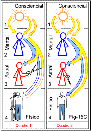 A rejeição a que se refere Lancellin trata-se do efeito de censura que o corpo Astral exerce sobre o Físico, como vimos na apostila 15, de onde repetimos a figura 15C, no parágrafo que chamamos de Remoção de Obstáculos. Para rememorar, no quadro 1 vemos o corpo Astral usando a “tesoura” para interromper o fluxo descendente do Eu Maior, impedindo-o de atingir a dimensão Física. E o que ele chama de “danos demorados” é tudo isso de que temos tratado ao longo dessas apostilas, nos referindo aos traumas inerentes ao processo do despertar espiritual, que, uma vez completado, fica como vemos no quadro 2, quando, então, temos o corpo Astral já devidamente domesticado e não mais obstaculando a descida do influxo consciencial.
