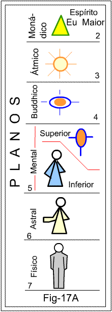 Com a figura 17A estamos demonstrando o posicionamento do Eu Maior e os respectivos corpos que ele rege. Permanentemente ele está no plano Monádico, seu plano natural de existência. Assim como o corpo físico que está permanentemente no plano físico. Ou dimensão Monádica. De lá, de sua central de existência, comanda os veículos de manifestação que, como sondas, atuam nas demais dimensões. Por exemplo, animando o corpo físico que atua na terceira dimensão. Neste universo que habitamos.