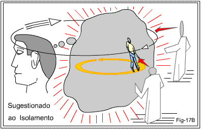 Diríamos, introversão obsessiva, algo como ilustramos com a figura 17B, pois num quadro deste o indivíduo, sem dúvida, se encontra prisioneiro de inteligências que intentam desestruturá-lo usando de argumento cujo sentido é a aversão pelo conviver com o mundo. Intentam fechá-lo numa concha, como uma ostra, sugestionando-o de que assim deve ser para se defender de alguma possível agressão. E lá fica ele em seu círculo vicioso de introversão.