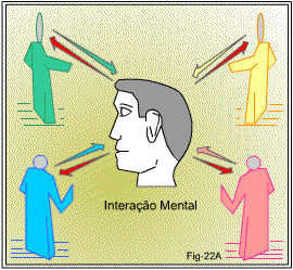Como exemplo ilustrativo temos a figura 22A. Nela temos seres em variadas colorações representando as inimagináveis inteligências existentes no cosmo, interagindo com o gênero humano da Terra. Interação mútua, porque nossas emissões mentais são registradas por elas. Esse intercâmbio, a todo instante está acontecendo, embora não seja claramente perceptível a todas as pessoas.
