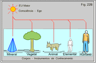 Vejamos como poderemos responder a essa pergunta. A série completa de nossos estudos vem mostrando a ampla jornada de vida pela qual a centelha espiritual de cada Ser tem viajado. Desde as formas mais rudimentares até ao homem, muitos têm sido os corpos que a consciência vestiu. Figura 22B.