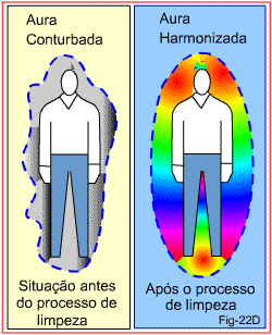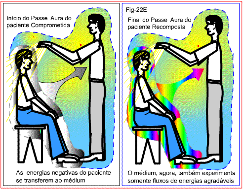 A figura 22E demonstra esse acontecimento que faz parte do trabalho assistencial que o médium de cura presta. No primeiro quadro, o médium envia energias corretivas ao paciente. Este, ainda com a aura tomada por energias nocivas, transfere-as ao médium que se comporta como canal de exaustão das mesmas. No segundo quadro, final do passe, a aura do paciente já está composta só por energias benéficas, recebidas pela intercessão do médium. Entre os dois, então, reverberam só energias agradáveis.
