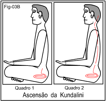 Para os que da Kundalini ainda não ouviram falar, oferecemos a figura 03B com dois quadros.  No quadro 1 vemos uma pessoa sentada em posição de meditação.  Em linha na cor vermelha temos uma espiral situada na base da espinha.  Essa espiral é a energia Kundalini em estado de repouso.  Em algumas pessoas ela permanece assim durante toda a vida.  Eu outras, entretanto, ela se desperta.  Esse despertamento pode se dar por espontaneidade ou por acontecimento, ou processos que forçam seu desencadeamento.  Sobre os efeitos de tudo isso não iremos falar neste momento.