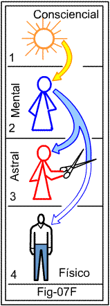 Na figura, o audacioso corpo Astral, “desobedecendo” ao comando central, “corta” o fluxo descendente.   Devido a isso, o comando do Espírito, representado pelo fluxo de energia, se torna imperceptível ao corpo Humano.   Este, por sua vez, com sua respectiva independência, não percebendo o alerta que vinha do “alto”, e mancomunado com o corpo Astral, continua seus procedimentos inconvenientes.