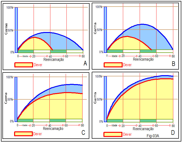 Quadro A – A pessoa, durante todo seu trajeto de vida, não dá atenção aos compromissos, ou ao Dever. Para ela, compromissos são circunstâncias que não lhe ocupam as preocupações. Seu gráfico existencial indica que muito pouco da linha cármica se cumpriu, e o fator Dever foi abandonado logo nos primeiros anos de vida. Nessa característica tem-se o agravamento do Carma, acumulando-o para outra existência, e uma sobrecarga do Dever que se mostrará mais contundente noutra encarnação.