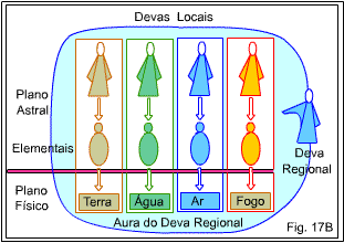 Vejam isso na figura 17B. Há um Deva local para cada categoria de elemento natural a ser ativado. Um para o elemento terra, etc. Os Elementais sob a tutela de dirigentes locais atuam sobre os elementos terra, água, ar e fogo. Todos eles, os Devas locais e os Elementais, estão sob a regência de um Deva que, naquela região, administra os acontecimentos gerais. E´ o Deva Regional.