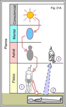 Entretanto, quando findava sua vida no corpo físico, (etapa 2 da figura 21A), e se transpunha ao plano Astral, continuava um tímido, (etapa 3 da figura), não compreendendo nada do que se passava, e quase não percebendo a mudança de plano de vida.