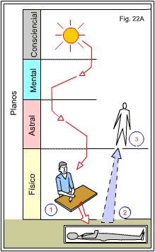 Esse fator de contínuo despertamento e interesses faz com que, mesmo estando no plano Astral, suas atividades não cessem. E´ o que vemos na figura 22A, etapa 3. Com o desencarne e a transferência definitiva ao plano Astral, lá ele continua dedicando-se às atrações que lhe são adequadas. E como sabemos que o mundo Astral é vasto em possibilidades, logo, não lhe faltará o quê fazer. Com isso, mais expansão adquire seu raciocínio e maior adestramento nas habilidades.