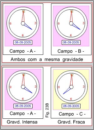 No quadro superior da figura vemos dois campos gravitacionais. "A" e "B", ambos com a mesma gravidade. Vemos que a marcação do tempo é igual para os dois, em data e hora.