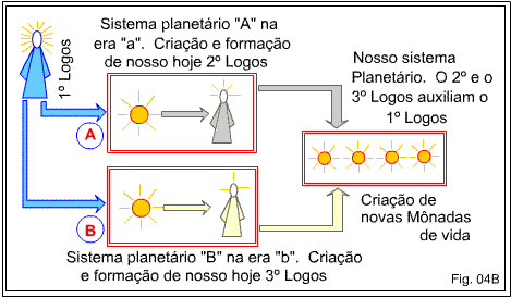 Desenhamos a figura ao lado, 04B, para melhor entender a descrição que estamos fazendo. Ela simboliza: Originando-se do 1º Logos vemos os 2º e 3º Logos. O 2º Logos originando-se numa era "a" em um sistema planetário "A". O 3º Logos, identicamente, mas numa era "b" em um sistema planetário "B". Sendo que a era "b" foi posterior à era "a". Portanto, o 3º Logos, em idade cósmica, é mais "novo" que o 2º Logos que, por sua vez, é mais "novo" que o 1º Logos.