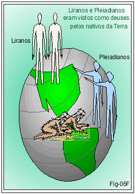 Os liranos eram os diretores físicos desse projeto (sob a supervisão dos Fundadores), e aceitavam, também, assistência de outros grupos físicos tais como os sírios. Logo se viu que para seu projeto necessitavam uma estrutura genética de origem terrestre e também extraterrestre. Contataram os pleiadianos. (Figura 06E)
