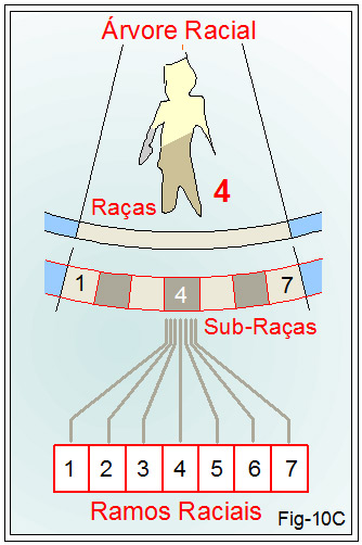 Mas não pára por aí a subdivisão das categorias dos aglomerados humanos nas diversas eras pelas quais ocorrem os povoamentos. Cada sub-raça também se subdivide por sete outros padrões que se denominam Ramos. Figura 10C. De início todo esse escalonamento pode parecer muito complexo de ser compreendido, entretanto, há que se ter em conta que os desdobramentos raciais na multifária capacidade evolutiva dos Seres assim o exige.