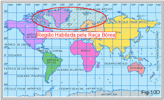 No mapa da figura 10D indicamos a região onde habitavam os seres da Raça Bórea. Entretanto, tenham em conta que a distribuição dos continentes, naquela era, não é a demonstrada no mapa. O planeta Terra passou por vários cataclismos que, a cada um, ia remodelando as disposições continentais. O mapa acima só nos serve como referência ao posicionamento do quadrante Norte.