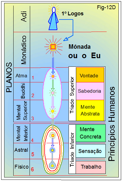 Detalhando a figura 12D – A Mônada em sua dimensão peculiar, ou o plano Monádico, permanece íntegra, ou seja ela E´. Corresponde dizer ao EU SOU dos mantras das doutrinas esotéricas. Digamos que, para os mundos manifestados, indicados na figura pelos algarismos 1 ao 6, em sua dimensão monádica ela se encontra como o feto no útero materno. Ou, acolhida num meio harmônico e protetor.
