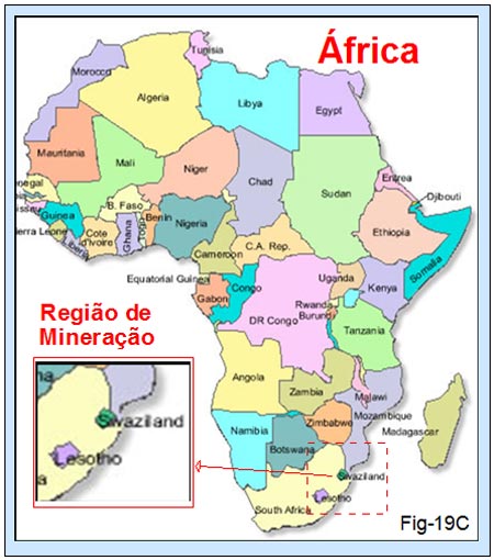 Todavia, os locais de mineração ficavam localizados na parte sudeste da África, onde hoje se encontram os países Suazilândia, Moçambique, Botsuana, Zimbábue, Lesoto e África do Sul. Figura 19C.