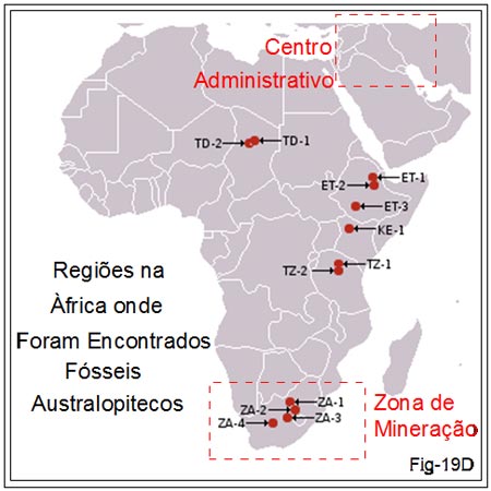 Comparem o mapa da figura 19C com este da figura 19D. Notem a proximidade da zona de mineração com os locais onde fósseis australopitecos foram encontrados.
