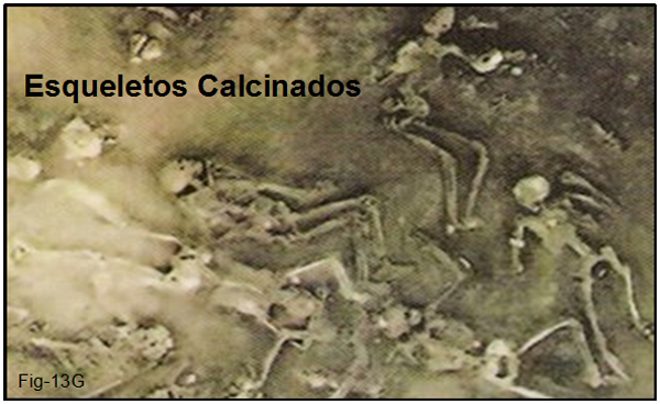 Figura 13G – Encontrados vários esqueletos calcinados. A datação dos esqueletos encontrados varia entre 1.900 e 1.500 a.C. Um fato curioso a respeito é que todos os esqueletos se encontravam deitados de costa com o rosto, isto é, a caveira, voltada para cima. Alguns com as mãos ligadas a de outros, evidência de que estavam de mãos dadas quando aconteceu o incidente. E que incidente. Também foram encontrados esqueletos de animais variados. Este posicionamento evidencia que algo instantâneo, e de forte poder destrutivo, aconteceu.