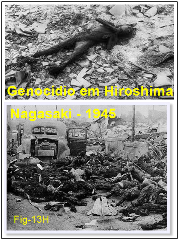Comparando as duas figuras 13G e 13H percebe-se grande semelhança entre os restos humanos, os cadáveres de há 2.000 anos atrás, em Mohenjo Daro, e os de 1945 em Hiroshima e Nagasaki que, sabidamente, foram exterminados em amontoados de vítimas.